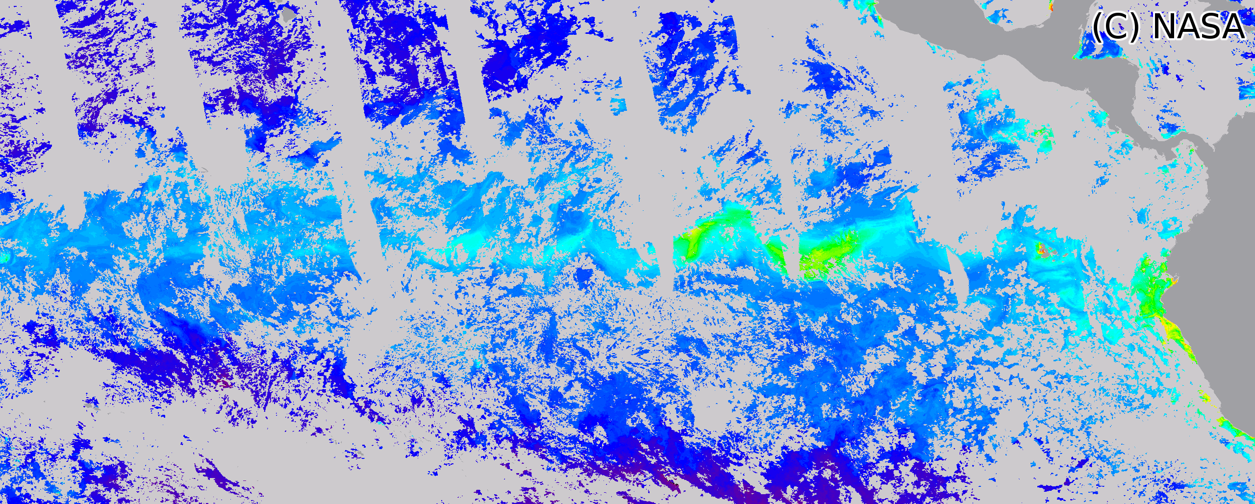 Global 3-days composite of MODIS chlorophyll concentration product, 2003/06/03 to 2003/06/05. Close-up on the Pacific Ocean equatorial divergence.