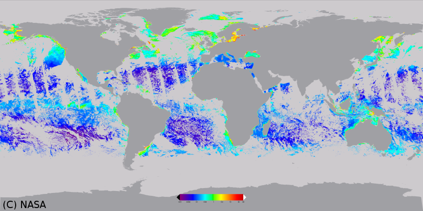 Global 3-days composite of MODIS chlorophyll concentration product, 2003/06/03 to 2003/06/05.