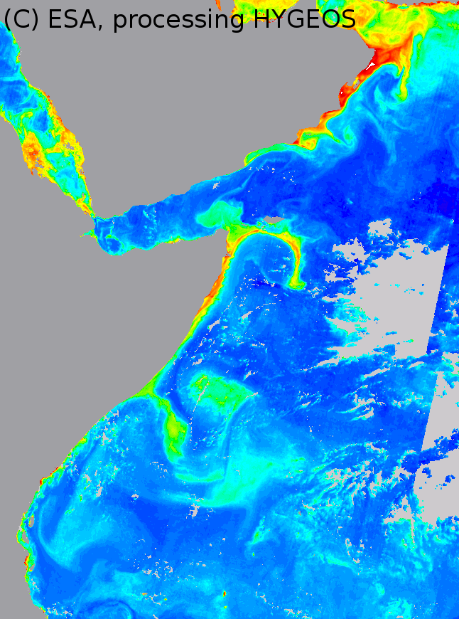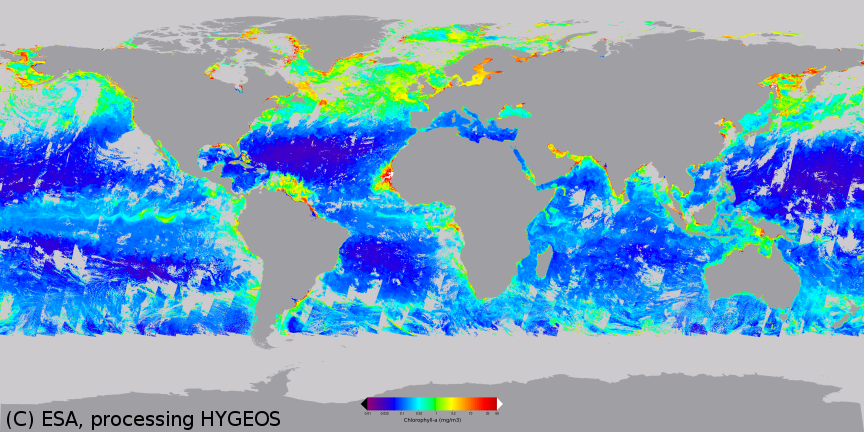 - Retrieves marine reflectances at 443, 490 and 560 nm, and the chlorophyll-a concentration