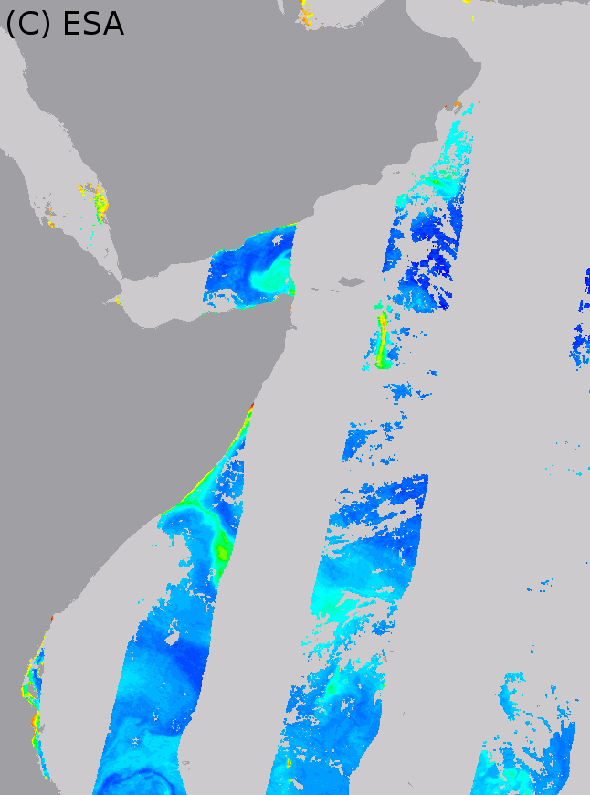 Global 3-days composite of MERIS standard chlorophyll concentration product, 2003/06/03 to 2003/06/05. Close-up on the Horn of Africa.