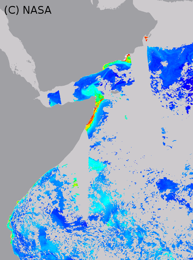 Global 3-days composite of MODIS chlorophyll concentration product, 2003/06/03 to 2003/06/05. Close-up on the Horn of Africa.
